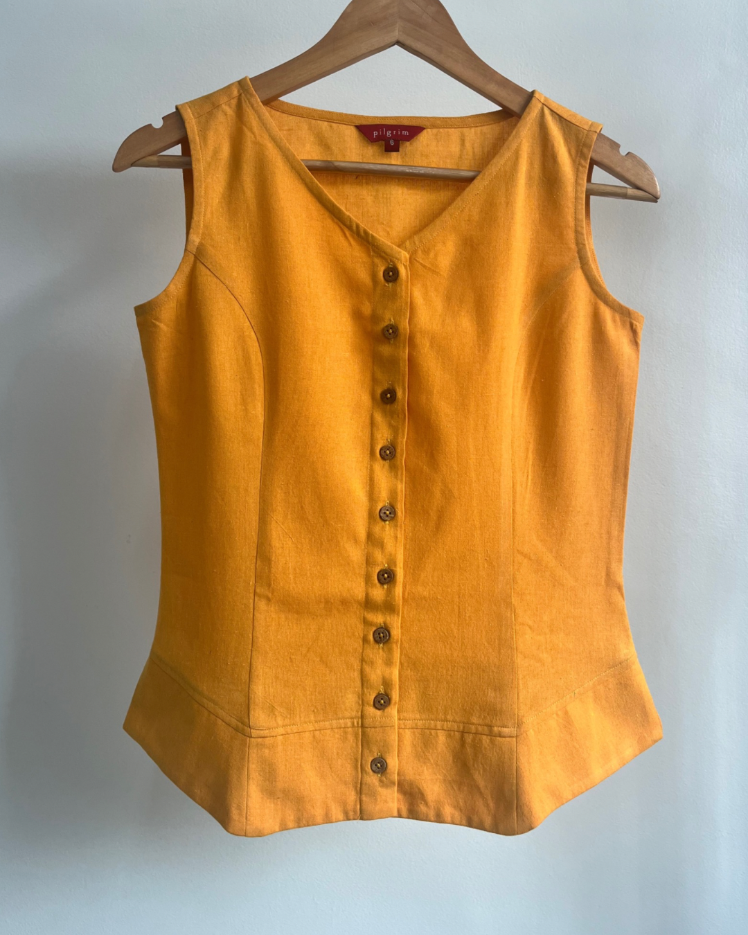 This top gets better and better every time I wear it! Excellent fit, just the right depth of neckline, deep saturated shade of yellow, the material gets softer with every wash, and the wooden buttons makes it stand apart from generic branded outfits.