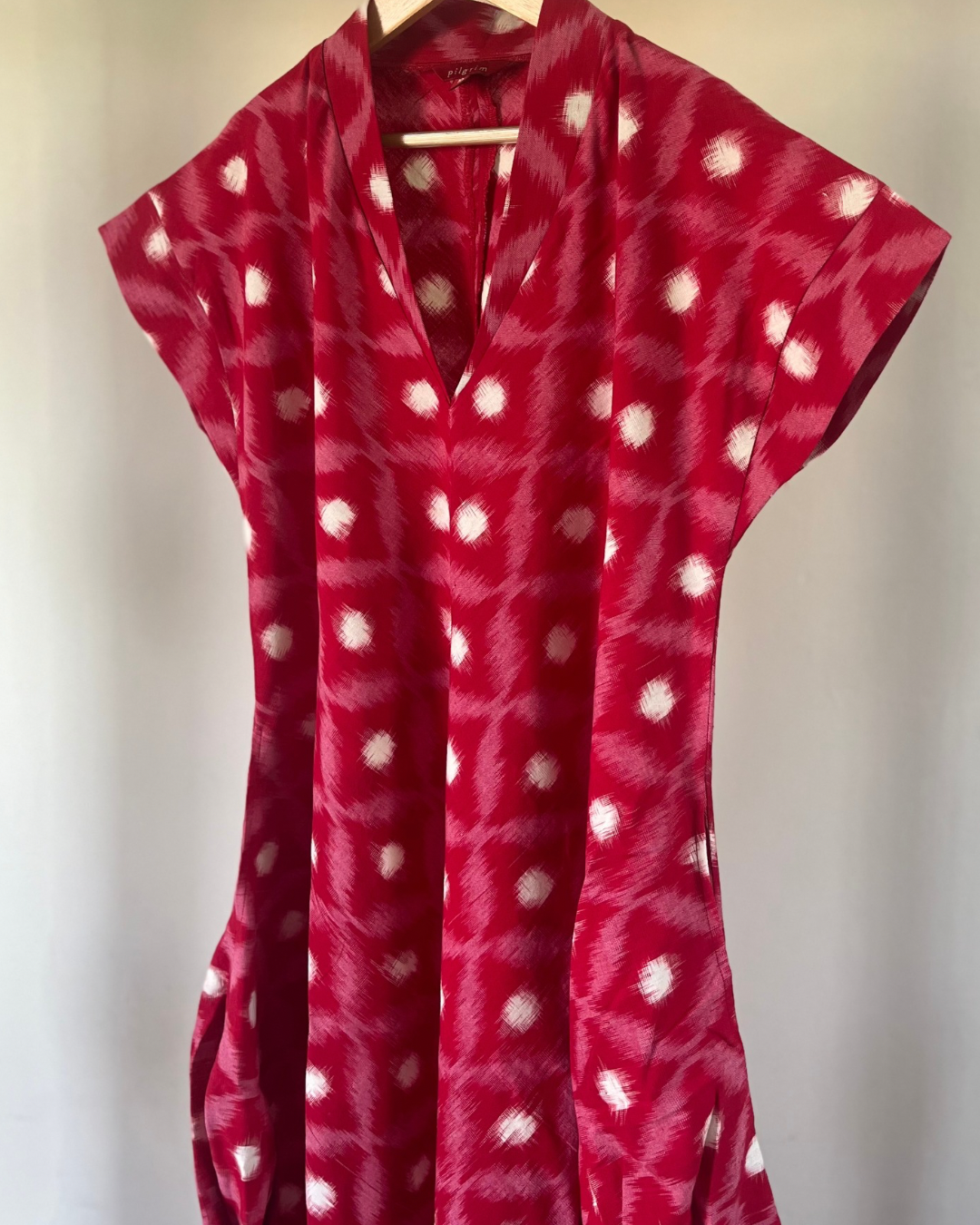 Side cowl dress in red geometric ikkat.