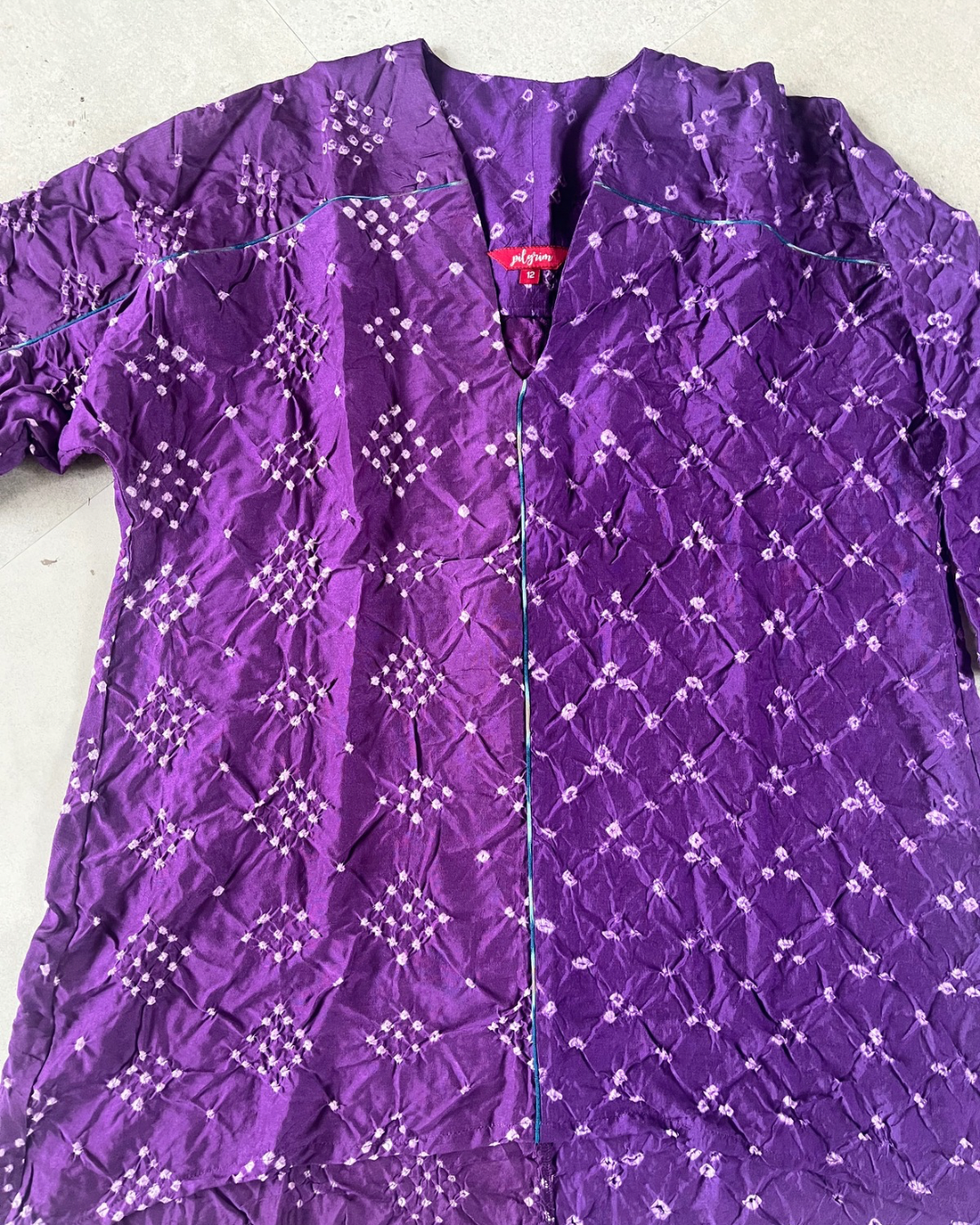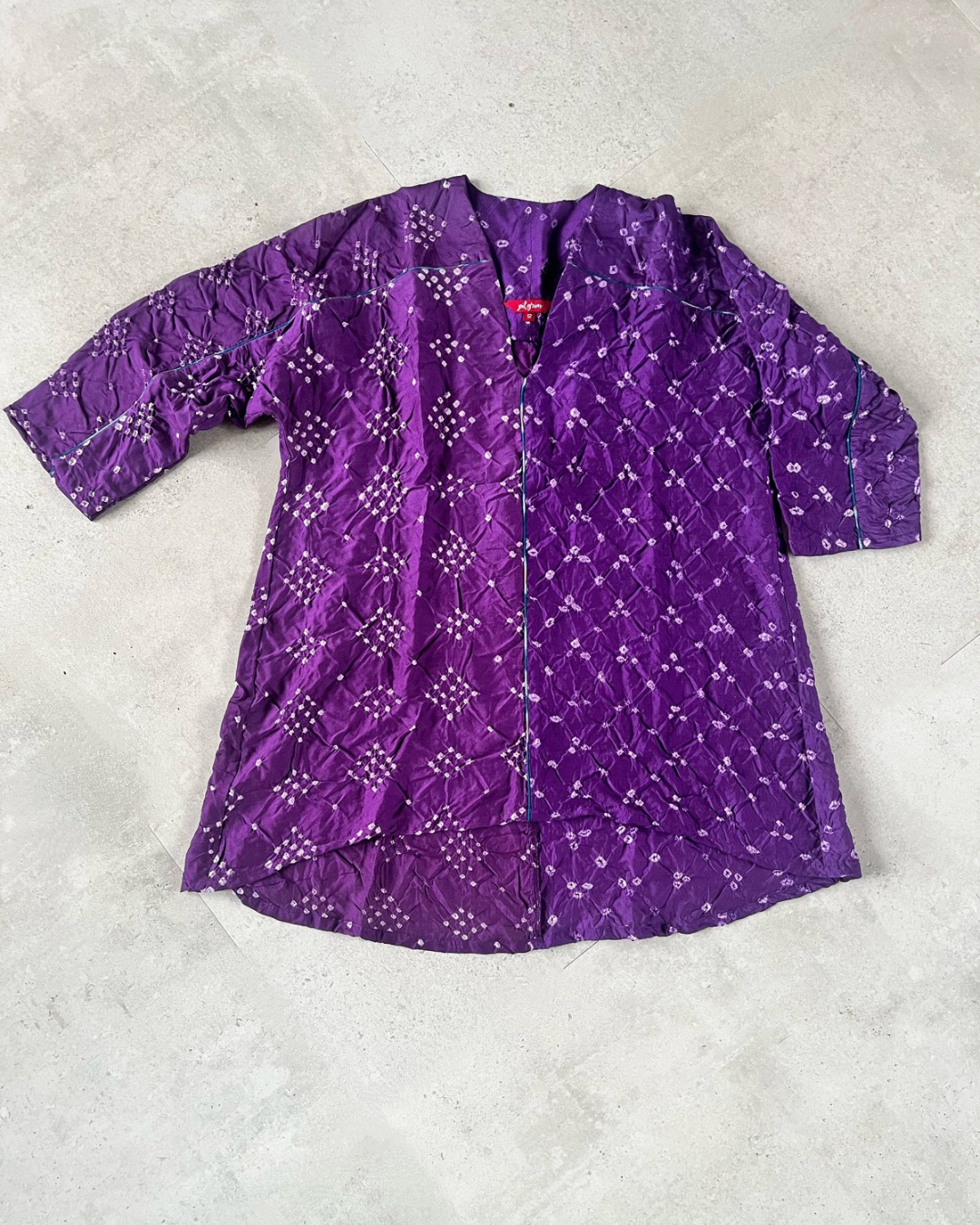 Fly away style In purple Bandhani with contrast piping in the front and sleeves.