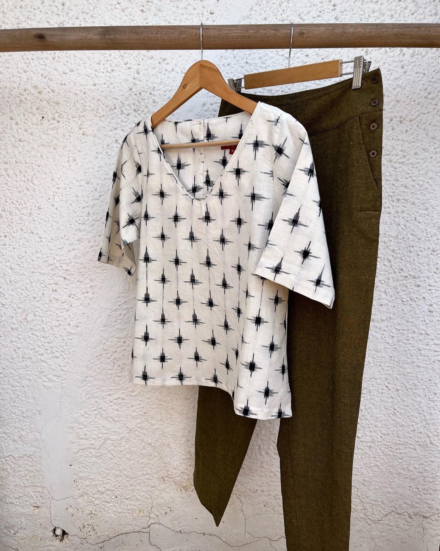 V necked top in White Black ikkat (sleeved).