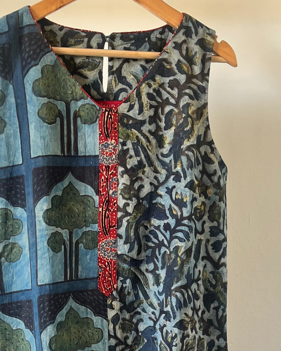 V necked dress ok n indigo block with front red Ajrakh detail.
