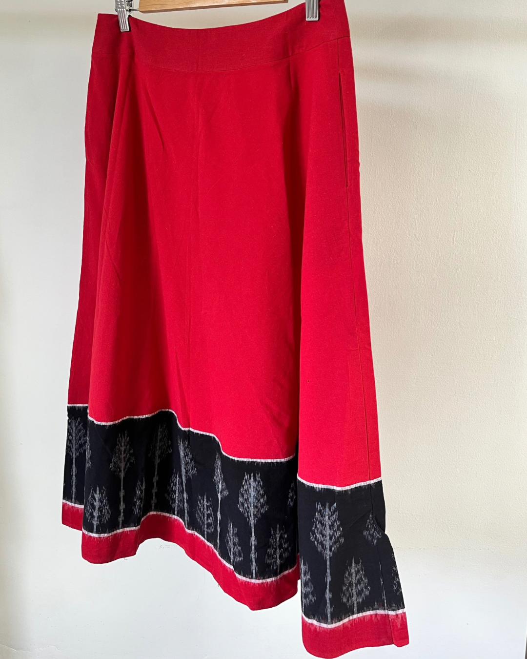 A- line calf length skirt in red cotton with broad ikkat border