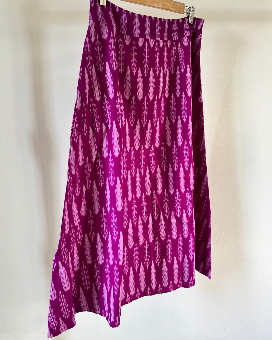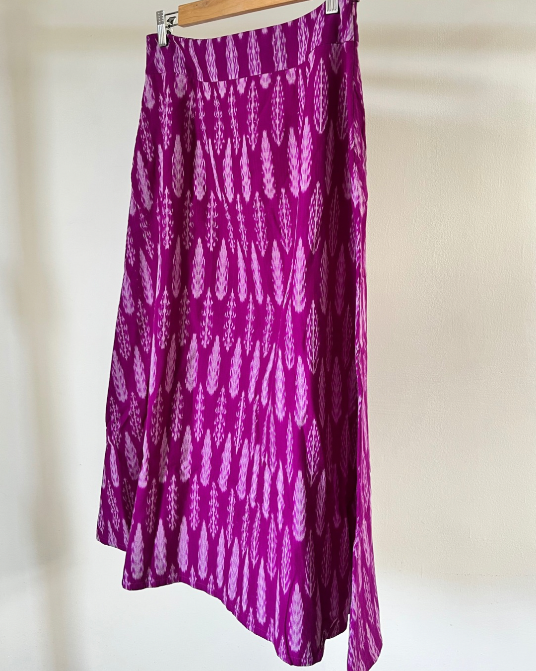 A- line calf length skirt in purple pink ikkat.