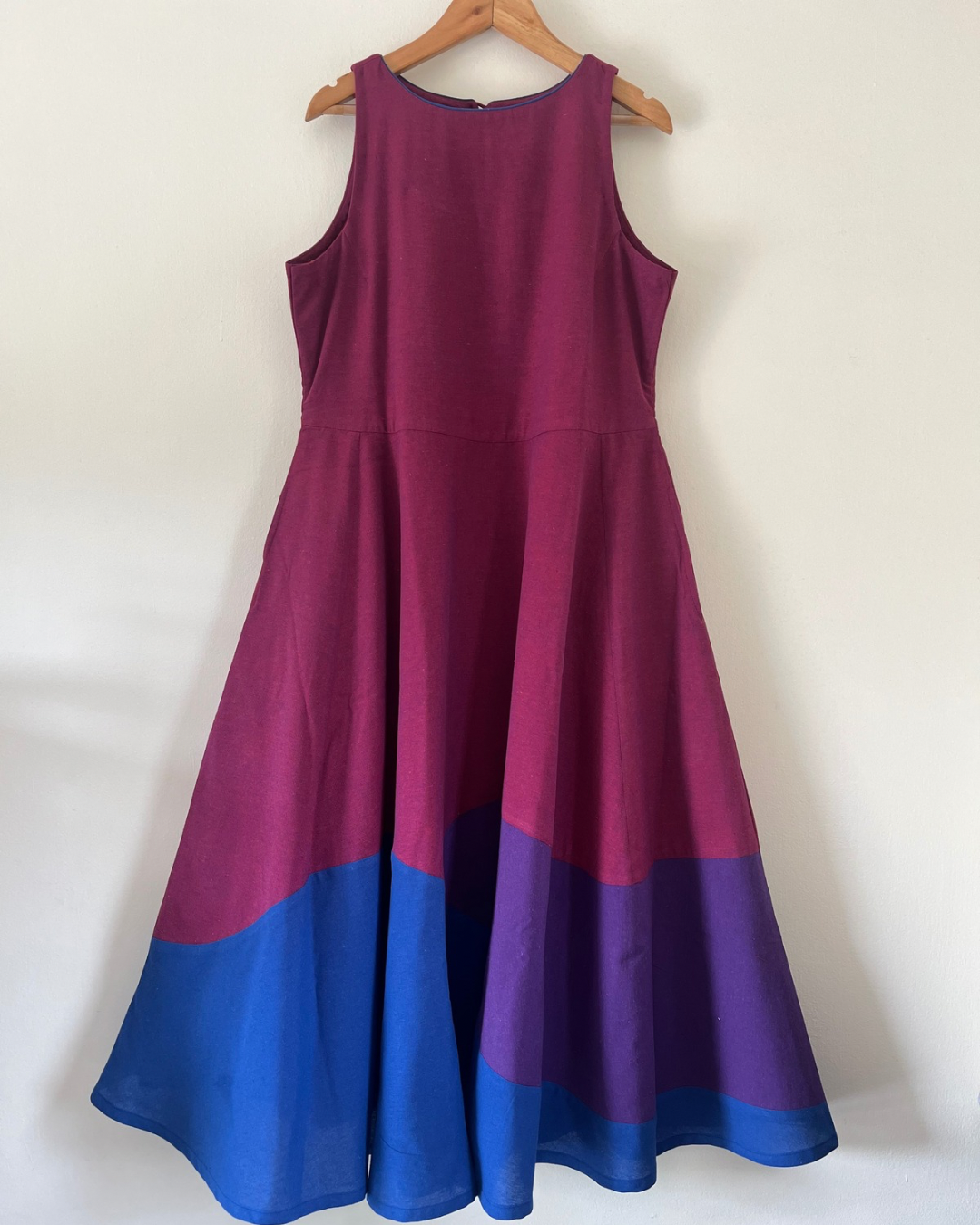 Fit and flare dress in pink cotton with patchwork in blue and purple cotton.