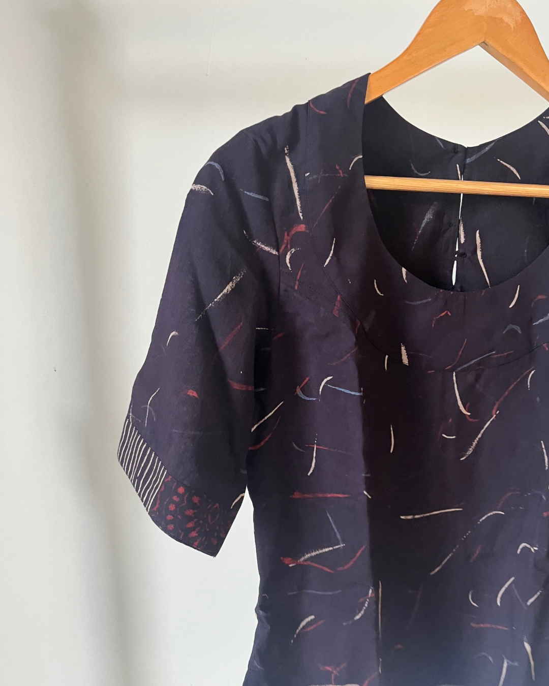 Round neck top in black ajrakh with contrast detail at the sleeve.