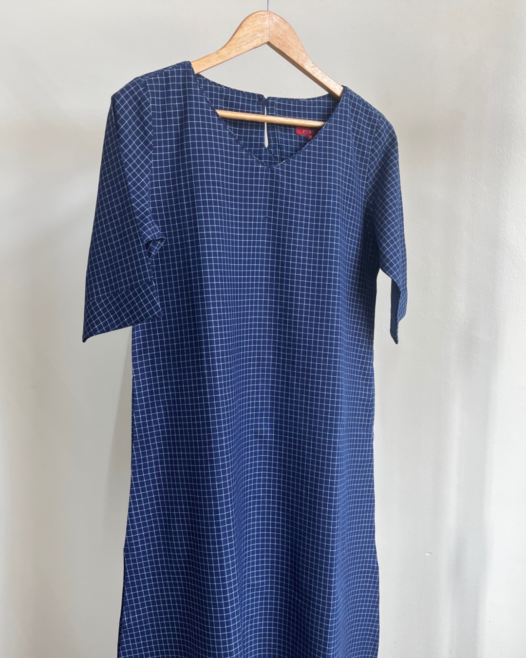 V necked kurta in indigo checks.